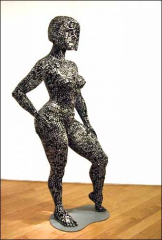 Les formes sensuelles et arrondies de Dominatrix, une sculpture monumentale de David Mach, lui confèrent l’apparence d’une nymphette contemporaine parodiant les poses de la statuaire antique. Entièrement composée de dés de dominos, soit d’éléments fabriqués en série et destinés à la société de loisirs, cette figure massive de plus de deux mètres est le produit d’un assemblage fragile autant que la métaphore d’un jeu de hasard.