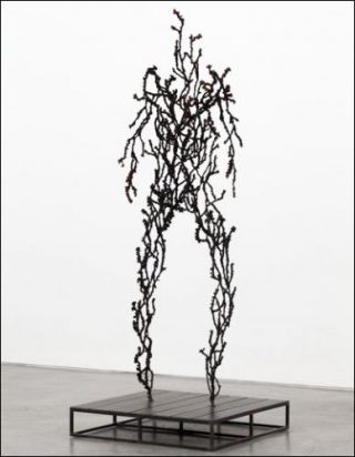 Enfin, Nick Van Woert présente une superbe sculpture anthropomorphe dont la surface, et les extrémités plus particulièrement, se trouvent oxydées. Réalisée à partir de moyens industriels et chimiques, cette sculpture ressemble pourtant à s’y méprendre à du corail, avec ses tons de rouille orangée, ou à un branchage, lorsque l’on s’attarde sur sa composition d’ensemble. Elle dessine ainsi une silhouette humaine, dont le corps et les membres se développent suivant une élégante arborescence.