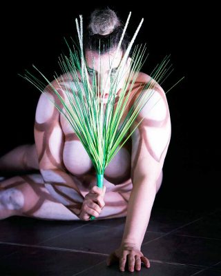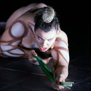 Teresa Vittuci apparaît sur scène en Vierge Marie. Du moins, la vision qu’elle souhaite en donner. Bien loin des représentations traditionnelles de la mère de Jésus, la voici presque nue, perchée sur de hauts talons et entièrement recouverte d’un voile transparent de couleur rouge vif, synonyme de passion. Des bandes marron tracent une musculature sur son corps peint en blanc. A ses côtés, un grand vase immaculé contient trois accessoires végétaux : un bouquet de fleurs blanches, une tige bordée de petites fleurs bleues, ainsi que de longues herbes vertes liées pour former une sorte d’éventail ou de fouet. « Ô Vierge Pure, Ô Vierge pure » entonne la danseuse, reprenant les paroles de l’hymne religieux Agni Parthene.