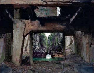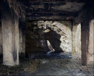 Sa première série, Les Amants, constitue une sorte de métaphore de ces rapports conflictuels entre la nature et l’homme, où le territoire de l’une est battu en brèche par l’autre. Au début de ce travail, Noémie Goudal s’imaginait un territoire désolé, où les hommes sont venus, puis sont partis, laissant derrière eux des vestiges de leur histoire. Pour elle, la nature ainsi que ces vestiges y construiraient ensemble un nouveau paysage. Les prémisses du travail étant ainsi posées, la photographe s’est intéressée à ces lieux qui constituent des éléments atypiques du paysage, comme des îles et des grottes. Elles sont, tant dans l’histoire que dans les légendes, empreintes d’une certaine dramaturgie, ou du moins propices à des reconstructions ou des mises en scène particulières. Le pendant de ces espaces naturels relativement difficiles d’accès est constitué de lieux industriels désaffectés et abandonnés, où l’on retrouve cette ambiance de sites en fin de vie. Elle ne se contente pas de les photographier comme s’il fallait en sauvegarder la mémoire, mais se les réapproprie comme «décor». Elle y installe en effet ses propres photographies de lieux similaires, agrandis à l’échelle du lieu investi, pour interférer avec ceux-ci et créer un nouvel imaginaire: «dans la construction de mes photos, je m’intéresse à la création d’une nouvelle perspective dans le cadre de l’image, en floutant les frontières entre le réel et la fiction, le vrai et l’inventé. Je me suis demandé comment il était possible d’entrer dans la perspective d’une image en offrant un paysage mi-réel, mi-artificiel».