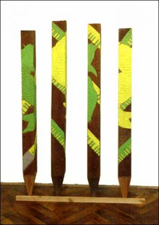 Faites de produits manufacturés, issues d’un processus de réalisation prédéterminé, les œuvres s’apparentent à l’art minimal, sans toutefois en avoir le caractère puritain et strict. Les objets s’égayent sous les couleurs vives, comme ces poteaux de clôture en bois récupérés sur un chantier, et sur lesquels ont été dessiné des carpes japonisantes fluo.