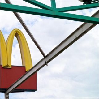 Nous sommes immergés dans les univers construits du paysage urbain moyen et de la Communication. Ces fragments architecturaux peuvent être dès lors appréhendés dans leur ensemble. Et ce sont trouble et malaise qui se définissent alors face à la contemplation … Tout n’est que logos de grands groupes commerciaux; ces centres commerciaux connus comme représentants d’une culture de consommation de masse et grand public. Fragmentés, recadrés, ces images de la culture populaire s’offrent soudainement à notre mémoire. Et l’image se crée dans son ensemble. L’aigle qui nous a emporté si loin dans notre interprétation somme toute imaginaire, en ce qui me concerne aux confins de l’ex URSS, est un détail du logo de Carrefour, âprement cadré par Maxime Touratier.