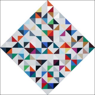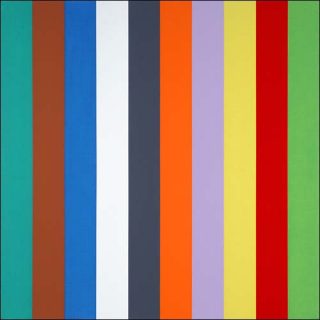 De même dans une petite salle, trois peintures de grand format carré représentent chacune verticalement dix bandes de couleur en à -plats disposées chacune différemment et sans logique — composition aléatoire d’un ordre apparemment rigoureux.