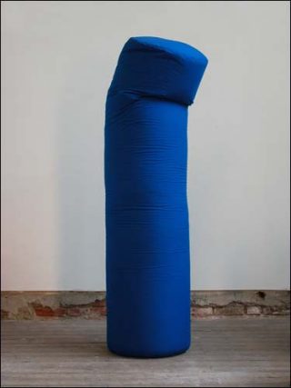 Dans une pièce adjacente, un autre mannequin couronné d’une ampoule de cent watts veille pareillement sur l’espace. L’archétype est engoncé dans sa gangue tubulaire de plexiglas teinté qui reflète les œuvres alentours, toutes en bleu Klein : un traversin immense posé verticalement, deux toiles de grand format grillées de blanc ; leur reflet dans l’installation au lumineux moule anthropomorphe produit un certain effet.