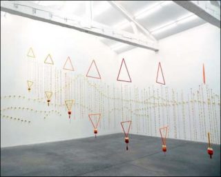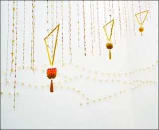 Ces «peintures-êtres», habitées ou hantées par ce qu’elles ont été — l’artiste confie d’ailleurs sa difficulté à les considérer comme siennes — abolissent radicalement la frontière entre celui qui regarde et l’objet de son regard. Converties à ce même mysticisme, les suspensions constituées de laine tricotée sur de fines baguettes de bois créent des couloirs ou tunnels mystérieux en lévitation dans l’espace. Toujours autour du tétraèdre, Vidya Gastaldon adopte pour Le long chariot Mixcoatl une figure moins géométrique et plus ornementée qui s’inspire d’organismes bioluminescents vivants dans les profondeurs océanes privées de la photosynthèse.
