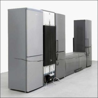 L’installation Fridge cut de Matias Faldbakken est composée d’objets quotidiens et universels: rubans adhésifs, sangles, armoires en métal, boîtes en carton et frigidaires. Les collages de la série Untitled (Garbage Bag) et Untitled MDF sont quant à eux constitués de sacs plastiques sur lesquels l’artiste a tracé des signes au marqueur. Les matériaux ordinaires sont façonnés pour devenir œuvre d’art : soudés, aplatis, collés, compressés, découpés ou recouverts de peinture. Pourtant, ils continuent d’incarner la société marchande à laquelle l’art se soumet. C’est cette fonction marchande de l’art qui est critiquée à travers les œuvres de Matias Faldbakken.