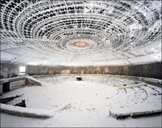 Ici, une immense salle — ancienne assemblée? — décorée de mosaïques et de symboles emblématiques d’une histoire elle aussi quelque peu déchue: la faucille et le marteau. Comme dans toutes les photographies de Vincent J. Stoker, nulle figure humaine. C’est la neige qui a recouvert le lieu.