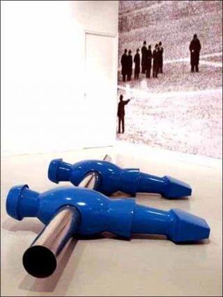 Ce sont des hommes pions, des anonymes qui gisent à nos pieds, inertes. La barre qui les soutient mais les transperce en même temps traduit un carcan et un poids qui limite leur liberté de mouvement. L’allusion au duel amplifie cette vision dramatique et relève l’absurdité de la destinée humaine. Patrick Guns fait également allusion aux codes d’honneur, aux duels maintenant codifiés à travers les compétitions sportives. Sa vision est toujours grinçante, mêlant humour et ironie, ayant toujours l’air de ne pas y toucher.