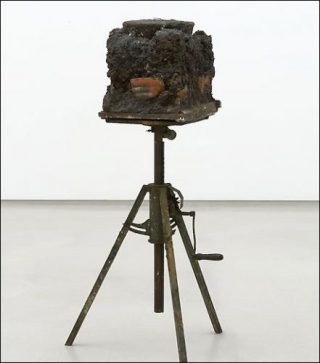 — Joseph Beuys, Boothia Felix, 1958/1982, Metal tripod, terracotta shards,, earth, rosemary roots, compass, 143 x 75 x 75 cm