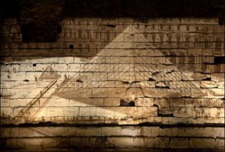 — Michal Rovner, Projection de pyramide sur mur des fossés médiévaux du Louvre, 2010. Vidéo