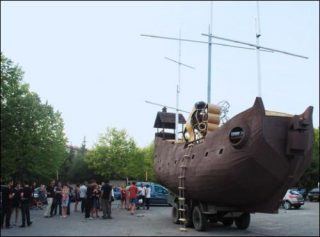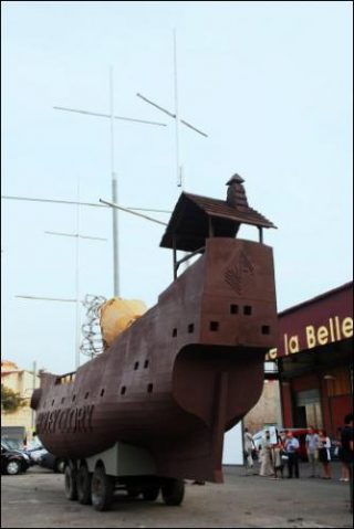 L’oeuvre prend la forme d’un bateau 3 mâts. Armé d’une structure d’aluminium revêtue de bois résiné et peint, celui-ci est fixé sur un fourgon militaire lui permettant ainsi d’être mobile et de naviguer, à l’aveugle. Il intègre un espace de vie et de travail visible par les ouvertures sur le flanc. Sur le pont, une cabane, un drapeau et une main signent l’amarrage de ce nouvel habitat. Leurs références se basent sur la culture et l’esthétique pop des 60’s, 70’s et 80’s (cinéma et séries B, musique, bandes dessinées, jeux vidéo, graphisme, science-fiction et littérature d’anticipation, art et kateboard…) C’est un art de la citation, de l’appropriation, du mixage et du mélange des genres.