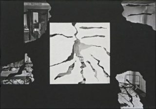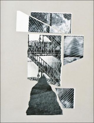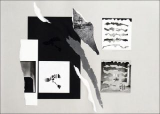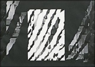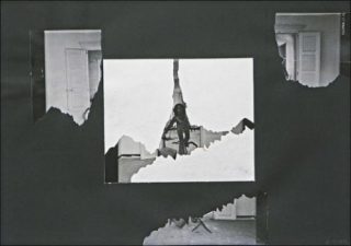 Holger Trülzsch. Un jour, en 1974, dans l’escalier de mon loft, dans des détritus, je trouve une grande photo d’une mise scène où un jeune homme est allongé sur la chaussée devant une voiture qui se rapproche; jeune homme que j’ai rencontré par la suite au Food. Je mets en scène cette photo dans l’escalier et la photographie, j’en fais un tirage que j’oublie par inadvertance dans le bain d’arrêt. Quelques heures plus tard, le tirage est solarisé et boursouflé, son émulsion se décolle du papier, les cloques sont autant de petites anamorphoses. J’arrache les parties décollées, le blanc du papier apparaît sous chaque déchirure. Je répartis et colle les fragments photographiques prélevés sur un papier noir et mat qui contraste avec les gris et la brillance du papier photographique et avec le blanc du papier écorché. Ce fond noir prolonge l’image photographique en un espace imaginaire, relie les fragments photographiques, reconstitue l’invisible.