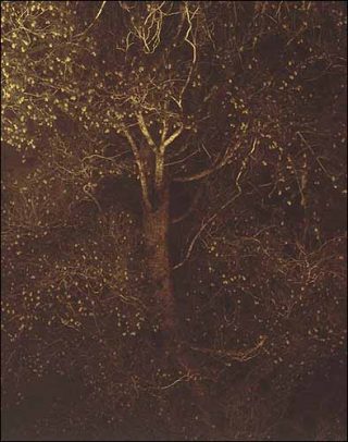 Ses prises de vue en poses longues capturent la moindre trace de lumière et mettent en évidence chaque détail, bien plus que ne le distinguerait l’œil humain. Un éclat émane de ces scènes d’extérieur nocturnes, une lumière qui sculpte les objets, comme dans la photographie d’un arbre dans la nuit, où l’on remarque faiblement les traces dorées, reflet de la présence suggérée des branches et des feuilles qui se détachent sur le fond obscur.