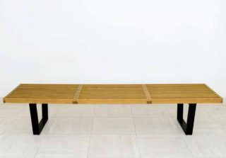 — George Nelson, banquette Platform Bench, 1946. Bois d’érable, piètement en bois à section trapézoïdale dont la finition est de couleur noir ébène.