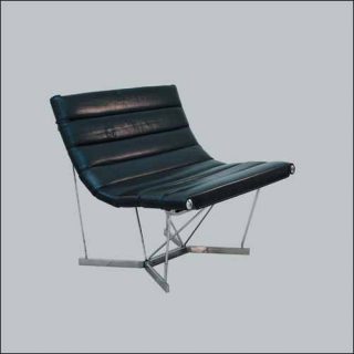 — George Nelson, Catenary, 1962. Assise en cuir enroulée autour de la structure en métal dont les points forts sont laissés apparents (boutons aux extrémités de l’assise), piètement métal.