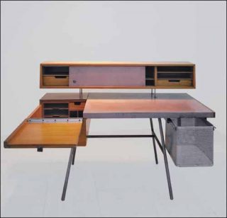 — George Nelson, bureau Home Desk, 1946. Bois de hêtre, cuir rose et rangement sur rail pour dossiers supendus en résille métallique, piètement tubulaire en métal.