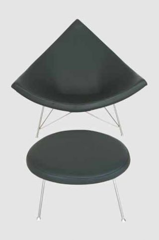 — George Nelson, fauteuil Coconut et son ottoman (repose pieds), 1954/56. Coque en plastique revêtue de cuir couleur vert bouteille et piètement chromé.