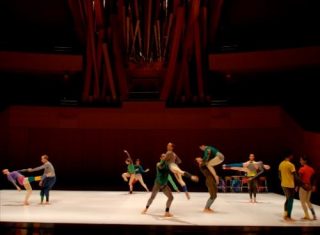 C’est sur Pond Way que s’ouvre la première soirée. Le rideau glisse sur l’étang scénique, où sont déjà en train de ricocher les silhouettes immaculées d’étranges albatros batraciens. Rêverie abstraite à l’épure idéale, laissant transparaître à travers la fluidité des tissus les traits marquants de l’art cunninghamien: danseurs comme absents, ou plutôt absorbés, ailleurs, entièrement dans leur mouvement, dos arqués entre les bras tendus vers le ciel, faisant du buste une voile de navire mue et gonflée par un vent imaginaire… Bonds spatiaux, pris sans élan autre que celui insufflé par l’énergie corporelle interne… auxquels succèderont deux grands sauts temporels!