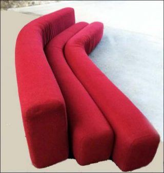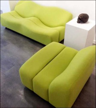 Chez Pierre Paulin, il y a une propension à vouloir assouplir ou effacer la ligne droite, y compris des murs et des structures, grâce l’usage du textile, comme le montre son travail sur les murs et les plafonds des appartements privés du Président Georges Pompidou ou la manière dont il a fait disparaître la distinction entre l’assise et le piètement d’un siège. Une recherche formelle dont on trouve l’écho dans des créations de design plus récentes.