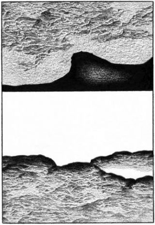 Il y a tant de Killoffer en vous et autour de vous. Pourquoi y a-t-il plusieurs Killoffer plutôt qu’un seul? Parce que c’est tout votre sentiment de l’Univers qui est l’objet de son investigation simultanément disciplinée et dissipée. Et il est obligé de se diviser et de se dupliquer, de se faire alternativement métaphysicien expérimental, patabiologiste ou géomètre de science folle, pour attaquer votre perception par tous les fronts, ne pas lui laisser un instant de répit, la saisir dans son moment de métamorphose pure, dans son passage entre deux formes. Killoffer invoque alors tous ses multiples qui deviennent les adjuvants de son implacable enquête sur vous. Et si ses bandes dessinées sont métaphysiques et scatologiques, pleines d’interrogations incessantes comme des coulées de chiasse mentale, les images de Killoffer sont eschatologiques et cosmologiques, mollement minérales, alternant ombres et formations géologiques. Elles font apparaître les formes originelles de votre affectivité dans une équivocité native que ne résoudra nulle discrimination. Tout sera toujours ambigu dans votre vie. Tout sera toujours réversible, bistable, carnavalesque, douteux. C’est la victoire incontestable sur le monde du canard-lapin. Joseph Jastrow avait raison.