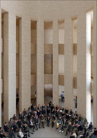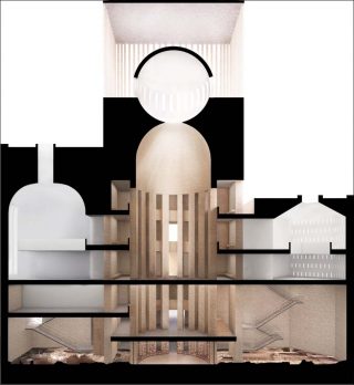 Aussi révolutionnaire sur le plan architectural que conceptuel, le futur bâtiment mêle des éléments architecturaux caractéristiques des trois religions. Prenant en compte la notion d’échange interreligieux qui le motive, le projet proposé par les architectes Kuehn Malvezzi comprend trois espaces de culte indépendants que relie au centre de l’ensemble une pièce commune. Le dôme et la terrasse panoramique de cette pièce centrale surmontent le bâtiment. A la fois lieu de prière et d’enseignement, House of One est ainsi ouverte aux rencontres et aux événements en commun. Elle constitue une sorte de ville miniature, à la fois peuplée d’habitants différents et identifiable en tant qu’entité unique.