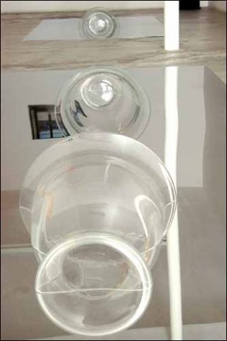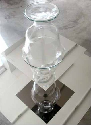 Quand intervient l’objet-simulacre, tout se brouille. L’objet-simulacre de la symétrie, c’est avant tout le miroir qui renvoie une image inversée — mais néanmoins fidèle — du même. Pour mettre à mal nos habitudes visuelles, l’artiste place des vases de verre tronqués sur des miroirs en acier poli (Swimmer, 2002). L’impression est saisissante : nos repères se brouillent face au double jeu du reflet et de la transparence. Les vases sont comme disposés à la surface d’une mare limpide qui en engloutirait une partie.