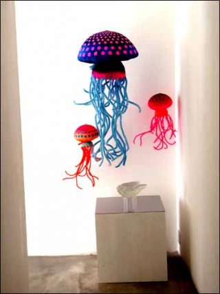 — Installation With Meduses. Plaque en acier poli et objets en verre et nylon coloré.