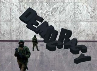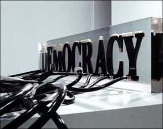 Stéphane Chatry a réuni à la Galerie Patricia Dorfmann trois artistes portant un regard fort sur la société contemporaine. Différents par leurs parcours, leurs origines, mais réunis par le même idéal humaniste, ils se remettent en question, expérimentent de nouvelles techniques, pour exprimer leur vision des droits de l’homme. Andreï Molodkin présente pour la première fois une sculpture d’acier, Falling Democracy. Baptiste Debombourg expose son dernier travail sur le verre et Zevs propose une série inédite, Heat, basée sur les couvertures de survie.