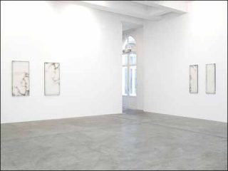 Dans la salle lumineuse et blanche du rez-de-chaussée, deux couples de stèles plates et verticales, d’albâtre couleur crème aux délicates veinures sombres (Presentation Windows), font face à un alignement de sept carrés de carbone, dont le noir, à la fois profond, brillant et parfaitement uniforme, est zébré de fulgurances discrètes (Lightning Serie).
