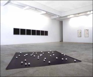 Ces paradigmes photographiques de l’indice, trace ou empreinte, et du négatif/positif, sont comme cristallisés dans la troisième installation. Sur une grande surface de papier-carbone posé à même le sol, sont disposées, apparemment de façon aléatoire, des boules d’une craie parfaitement blanche. On devine les points de contact entre les deux formes, plan et sphères, les deux minéraux, craie et carbone, et leurs deux valeurs contraires, comme autant de points d’un improbable équilibre.