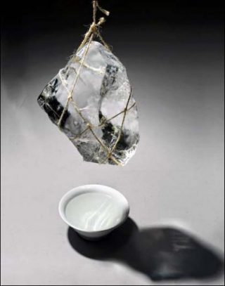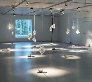 L’exposition est également une évocation du temps qui passe, de l’éphémère et du transitoire. Fonte de la glace, changement d’état de la matière, chute d’une goutte d’eau, brefs sons clairs et tintements, tesselles de porcelaines suspendues tissent un univers fragile qui, tel un paysage neigeux, sous l’apparente immobilité ne cesse de se transformer. L’exposition s’organisera principalement d’une version pensée pour Le Bon Accueil de son installation pour glace et bols amplifiés, ainsi que d’une nouvelle oeuvre constituée de fragments de porcelaine suspendus tintant au moindre souffle d’air.