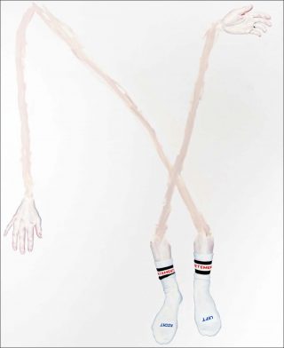 Chaque tableau réunit ainsi les mêmes membres dans une déclinaison de compositions similaires. Le contraste entre le traitement très réaliste des pieds et des mains et celui au contraire rudimentaire et parfaitement fantaisiste de leurs prolongements donne aux œuvres l’aspect d’une association entre peinture et photomontage. Il y a du super héros mais aussi de l’humour noir dans ces évocations de membres démesurément étirés, pliés de façon incongrue et directement reliés les uns aux autres sans être connectés à un corps entier. Ces pieds et mains autonomes, raccordés par de vagues coups de pinceaux se meuvent sans être guidées par une tête pensante. Mus par une volonté propre, ils se lovent en un câlin imaginaire, déploient leur élasticité dans une course fictive ou s’étirent en un geste dont la finalité est à inventer.