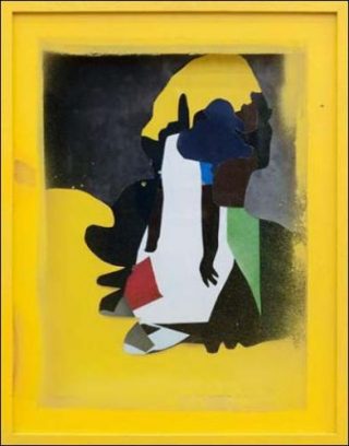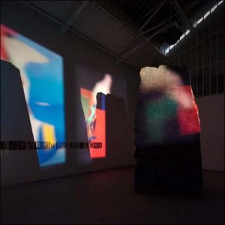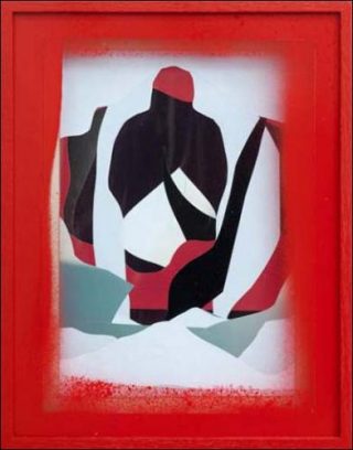 Du format d’un petit portrait, ces collages brillants (Nico Vascellari découpe et assemble des surfaces monochromes dans les magazines), comme leurs pendants photographiques, forment des silhouettes, des profils, que la pénombre ambiante rend moins discernables encore, quand la pierre ne mutile pas, ou n’obère tout à fait leur vision. Ainsi monté, le dispositif ne paraît pas complètement abouti: les collages, que l’on devine pourtant pleins de grâce, pâlissant quelque peu au creux de l’ombre décuplée de la stèle qui, décidément, engloutit tous les regards. Car elle est ce point aveugle et ce point indépassable, où — en un même mouvement lors même qu’immuablement — tout se perd et tout se réfléchit, s’abîme.