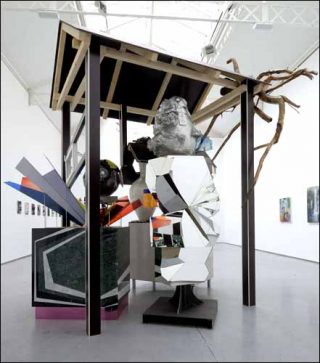 — Bernhard Martin, Nahe den Kröten, 2005. Aluminium, Plexiglas, acier, fer, céramique, verre Tiffany, pierre klinker, verre et branches. 300 x 320 x 280 cm.