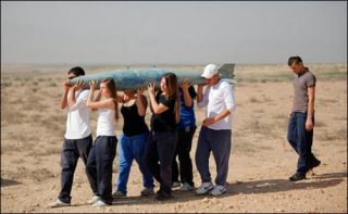 Le travail de Joseph Dadoune s’inscrit dans un projet global social et artistique. Depuis près de douze ans, cet artiste franco-israélien travaille auprès de la communauté de sa ville d’enfance pour valoriser et redynamiser les différentes activités tant culturelles qu’économiques de la ville. Ofakim, est une ville industrielle du Negev, construite sur le sable en 1955 qui n’a pas pu résister aux différentes crises économiques. Suite à la fermeture des usines et à l’explosion du chômage, l’avenir s’est progressivement assombri, notamment pour la jeune génération qui déserte progressivement. Dans son court-métrage, Ofakim, Joseph travaille sur le rêve de cette jeunesse abandonnée: dix adolescents dans une procession macabre transportent un missile de l’usine «Of-Ar» (lieu d’un projet architectural de réhabilitation d’une ancienne usine de textile en centre culturel) vers Gaza, d’où il sera lancé.