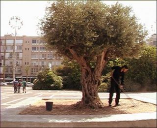 Lorsque la caméra s’éloigne, le spectateur réalise que l’arbre entretenu est au milieu de la place Yitzhak Rabin à Tel-Aviv, lieu hautement symbolique puisqu’il s’agit de l’ancienne place des rois où le premier ministre israélien fut assassiné en 1995 lors d’une manifestation pour la paix. Raafat Hattab veut continuer à entretenir l’arbre, symbole de son exil sous le regard indifférent des autres habitants.