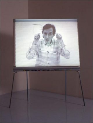 — Éric Duyckaerts, How to Draw a Square, 1999. Blocnotes géant, crayon, lecteur DVD, vidéo projecteur. 180 x 134 x 100 cm.
