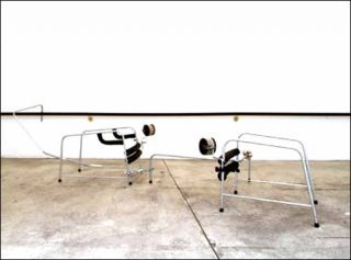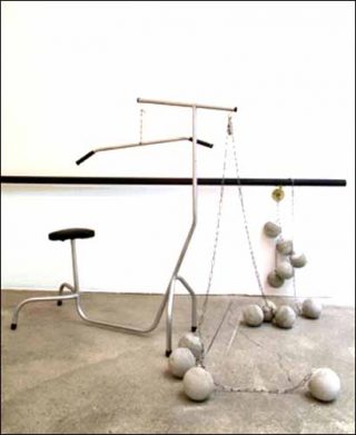 Selles de vélo, barre amovible, chaînes reliant entre elles des boules de ciment, tout pousse à croire qu’un secret rapport de causalité a motivé ces rapprochements. La selle de vélo n’est-elle pas là pour suggérer une dimension ludique ou utilitaire de ces dispositifs ? On parcourt mentalement le mécanisme de l’objet, essayant d’imaginer ce que sa mise en branle pourrait provoquer, mais c’est en vain. On ne pourra pas l’essayer non plus, en raison de sa taille minuscule. Non seulement l’objet se ferme à toute logique d’usage mais il nous tient également à distance par son échelle inadéquate. Notre sort est semblable à celui de Gulliver que sa taille rend étranger à ce qui l’environne.