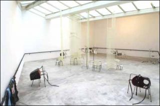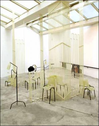 Les opérations de réduction des pièces à leur plus simple appareil confèrent à l’ensemble un caractère spectral. Composée de fines rangées de tuyauteries reliant le sol de la galerie au plafond, l’installation centrale articule l’espace en plans distincts, auquel de petites chaises transparentes disposées par endroits donnent un semblant d’humanité. En suggérant la présence du corps d’une manière indicielle, Trouvé pointe le caractère désert d’un lieux potentiellement vivable. Mais tout en feignant la disponibilité, les pièces sont rétives à toute saisie définitive, qu’elle soit d’ordre physique ou conceptuelle. Renvoyant le sujet à ses interrogations et à ses doutes, leur caractère ironique empêche toute impression de maîtrise. Contribuant aussi à les creuser efficacement, elles font durer cet espace incertain du doute qui nous tient suspendu comme à un rêve éveillé.