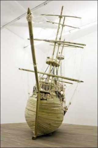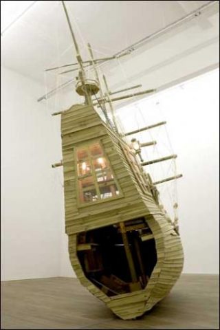 Twice Upon a Time/Il était deux fois est une caravelle de 5 mètres de longueur et de hauteur, pas tout à fait à taille humaine, pas non plus un jouet. Elle prend tout l’espace de la galerie, et celui du rêve aussi, qu’elle fait grandir quand le visiteur en fait le tour, qu’il se penche aux hublots, visite la sculpture du regard.