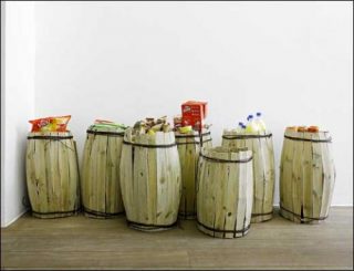 Humour quand le visiteur remarque enfin que les lanternes de la maquette sont à l’échelle 1, trop grandes pour la nacelle elle-même. Décalage aussi lorsqu’il entreprend l’inventaire des marchandises contenues dans les tonneaux de bois du navire: rien de substantiel; un choix qui semble poser la question très personnelle de l’essentiel et du superflu.