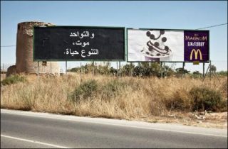 Le projet Subtexts consiste en l’insertion de messages et de citations écrites en arabe diffusés dans la communication locale (affiches, panneaux publicitaires, mobilier urbain pour l’information, presse, radio et TV) sans traduction dans la langue officielle. En introduisant ainsi des messages relatifs à des aspirations singulières, Democracia rompt le consensus de l’espace public.