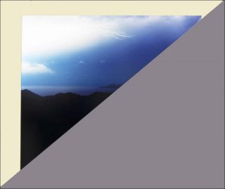 Ici une photographie de ciel est imprimée sur une surface concave. Ailleurs, une vue de collines en contre-jour, au-delà desquelles s’étend une mer bleue surmontée d’un ciel traversé d’éclairs semble être mise en valeur par le passe-partout jaune qui la borde mais une coupure en diagonale, qui recouvre toute sa moitié de gris, vient rompre la plénitude de l’image.