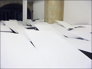 À l’occasion de cette exposition, la plasticienne Caroline Molusson a choisi d’investir les deux tiers de la surface de la galerie avec l’installation Image du monde flottant. Cette œuvre réalisée à partir de plaques de polystyrène découpées s’offre au regard comme un paysage monochrome accidenté installé à plusieurs dizaines de centimètres au dessus du sol. Flottante et invasive, l’œuvre découpe l’espace en deux, fend le vide en recréant un espace dans l’espace parvenant ainsi à établir une relation entre sculpture et architecture. Image du monde flottant synthétise l’approche formelle de la plasticienne qui, à travers l’utilisation de matériaux pauvres, interroge inlassablement la notion d’économie du geste artistique et la perception de la réalité.