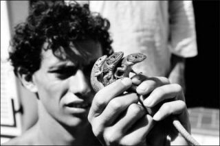 Archétype ? Oui, si l’on relève que chaque portrait exposé ne désigne rien d’autre que l’«homme nature». Non pas le Bon sauvage rousseauiste objet de tant de spéculations mais un type d’humain plus proche, celui-ci, de l’humanisation concrète que du champ philosophique. Regardons. Ici, nous voyons le jeune Érik Samakh serrer entre ses mains, comme un trésor, trois magnifiques lézards. Là , nous le voyons nu, seul au milieu d’un territoire sombre de basalte, tel le chasseur du paléolithique à l’affût, encore qu’il s’agisse pour lui d’enregistrer des sons, ou de capter des images. Une autre photographie montre l’artiste tapi dans une forêt, et une autre encore, s’adonnant à quelque collecte plus ou moins mystérieuse dans une nature aux allures de climax, de lieu édénique de commencement du monde. Encore, au beau milieu d’une mare, tenant une longue perche, une attitude combinant celles du pécheur et du perchman…