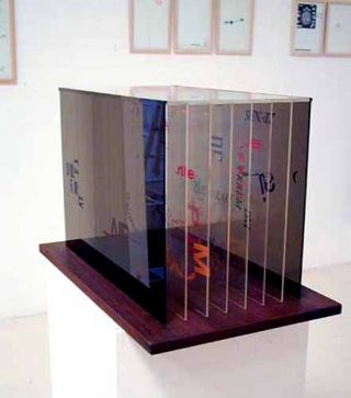 — Not Wanting to Say Anything about Marcel, 1969. 8 plaques de plexiglas sérigraphiées, base en bois. Plaques : 35,6 x 0,32 cm, base : 36,8 x 61 x 2 cm.