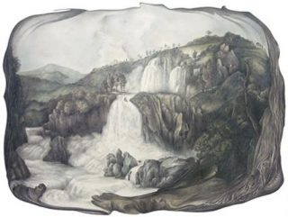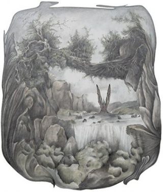 Pour autant, avec une douce résignation, le monde continue à vivre lentement, à un rythme amoindri, comme dans un coma: Hélène Muheim représente ainsi, «inlassablement, ce qui n’est plus», et c’est avec patience qu’elle préserve ce qui reste néanmoins, sous les strates de la conscience, dans le souvenir d’un bruissement du vent dans des feuilles d’arbre ou dans celui d’un drame lointain. Pour cela, elle «maquille» ses paysages comme on maquille des paupières, délicatement, en estompant tellement que les pigments ne font plus qu’un avec la finesse de la peau ou celle du papier: «je maquille les reliquats du monde», dit-elle. Ces reliquats, reliques et traces, l’artiste les trouve aussi dans l’histoire de l’art, dans les sources qu’elle utilise pour réaliser ses dessins, que ce soit l’œuvre d’un sombre graveur suisse du 19ème siècle représentant la Vallée de Chamonix, celle du renaissant Joachim Patinir ou encore les paysages à l’arrière plan des tableaux de Léonard de Vinci. Que l’on pense justement aux arrêtes des montagnes bleues de sa Sainte Anne pour saisir la complexité d’un paysage à la fois acéré et léger, violent et mystérieux, en surface et en méandre.