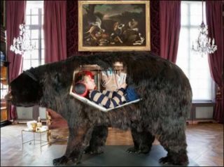 «Inside» nous propose également de nous confronter à des espaces confinés ou démesurés. Par exemple, Abraham Poincheval se livre à une expérience autarcique tout à fait étonnante. Il se filme en train de vivre dans le ventre d’un ours empaillé, tel Jonas englouti dans l’estomac de la baleine. Solitaire, coupé du monde, il continue pourtant le train-train de son existence dans cet abri improbable et minuscule, se préparant du thé avec une bouilloire ou mangeant une galette.