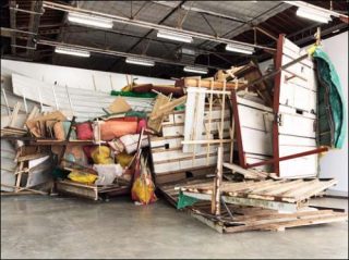 L’immense structure hybride de Peter Buggenhout nous plonge quant à elle dans un univers anarchique et surréaliste où s’entassent du bois, du polystyrène, de la tôle ou du métal, formant un impressionnant bric-à -brac. On déambule dans les méandres de cette architecture, sorte de labyrinthe dévasté, balayé par la soufflerie de châteaux gonflables éventrés.