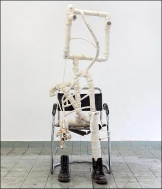 Renaud Jerez (né en 1982, vit et travaille à Berlin) révèle, dans ses installations, les mécanismes de contamination et de consommation. Il crée des avatars à partir de tubes en Pvc, de matériel de sport, de peinture camouflage, de gants en latex et de baskets, qu’il présente aux côtés d’habiles vidéos détournant l’esthétique des publicités pour les cosmétiques.